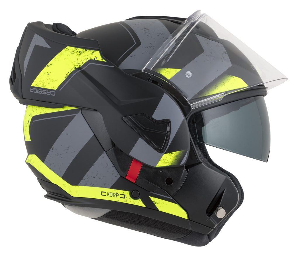 • Dual homologation ECE 22.06 P/J for both open-face and full-face use, with the option to lock the flip-up section in the open position using a safety latch.