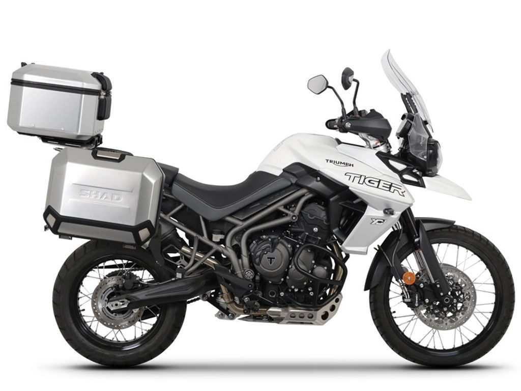 Komplet aluminijastih kovčkov z nosilci in ploščo SHAD TERRA, 37L zadnji kovček in 36L/47L stranski kovčki SHAD TRIUMPH Tiger 800