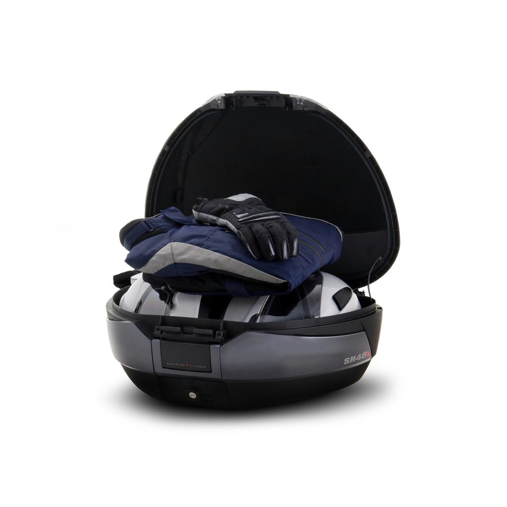 Kovček s kapaciteto za dve celoobrazni čeladi Top case SH48 je vrhunski izdelek, ki izpolnjuje vse zahteve trga in ponuja maksimalno zmogljivost. Z zmožnostjo držanja dveh čelad, ki pokrivata celoten obraz, in težo 3,7 kg je najlažji zgornji kovček z visoko zmogljivostjo na trgu. S tem zmanjšamo tresljaje, saj so nosilci in okvir motocikla manj obremenjeni. Njegov strukturni okvir zagotavlja visoko togost in odpornost z minimalno težo. Ponuja največjo varnost zahvaljujoč inovativni hermetični ključavnici "Smart Lock System", s samodejnim izvlečnim ročajem in hermetično ključavnico v 3 položajih. Ta sistem omogoča, da zgornji del ohišja ostane odprt brez možnosti izvleka in ga je mogoče odpreti in zapreti brez ključa, tako da potrebuje le ključ za blokiranje. Lahko se odpre samo z eno roko. SH48 ponuja več konfiguracij za prilagajanje, ki združujejo barvo stranskih pasov z zgornjimi pokrovi. Kot opcijo imamo novo možnost karbonskega videza, ki se kombinira s katero koli barvo motocikla. Imamo tudi pokrove v beli, kovinsko črni barvi in v enaki barvi kot pas ohišja: New Titanium ali Dark Grey. Ima tudi možnost niansiranja, ki jo lahko prilagodite svojemu okusu. Kot dodatno opremo nudimo dvojno naslonjalo, notranjo torbo, kovinsko zgornjo rešetko in zavorno luč. Dvojno naslonjalo za hrbet (D0RI4800) nudi več udobja za sopotnika in daje edinstven slog celotnemu kolesu. Notranja torba (X0IB00), z zgornjo odprtino in zunanjim žepom za neposreden dostop, je ojačana z notranjo peno, ki ščiti vsebino pred udarci, ter trakom in ročajem za lažje prenašanje. Na ta način notranja torba olajša transport vaših stvari, ne da bi morali odstraniti zgornji kovček. Zgornja kovinska rešetka (D0PS00) poveča zmogljivost kolesa pri enaki največji obremenitvi in ima tudi posebne jezičke za trakove za prtljago in torbe za pritrditev in zadrževanje tovora. Končno, zavorna luč (D0B29KL) je izdelana z energetsko varčnimi LED diodami in je zelo enostavna za namestitev, saj se prilega spodnjemu delu zgornjega dela ohišja. To poveča varnost, saj je kolo bolje vidno od zadaj. Kot ostali zgornji kovčki za motocikle SHAD (razen za TR48/TR37) vključuje ploščo in komplet vijakov.