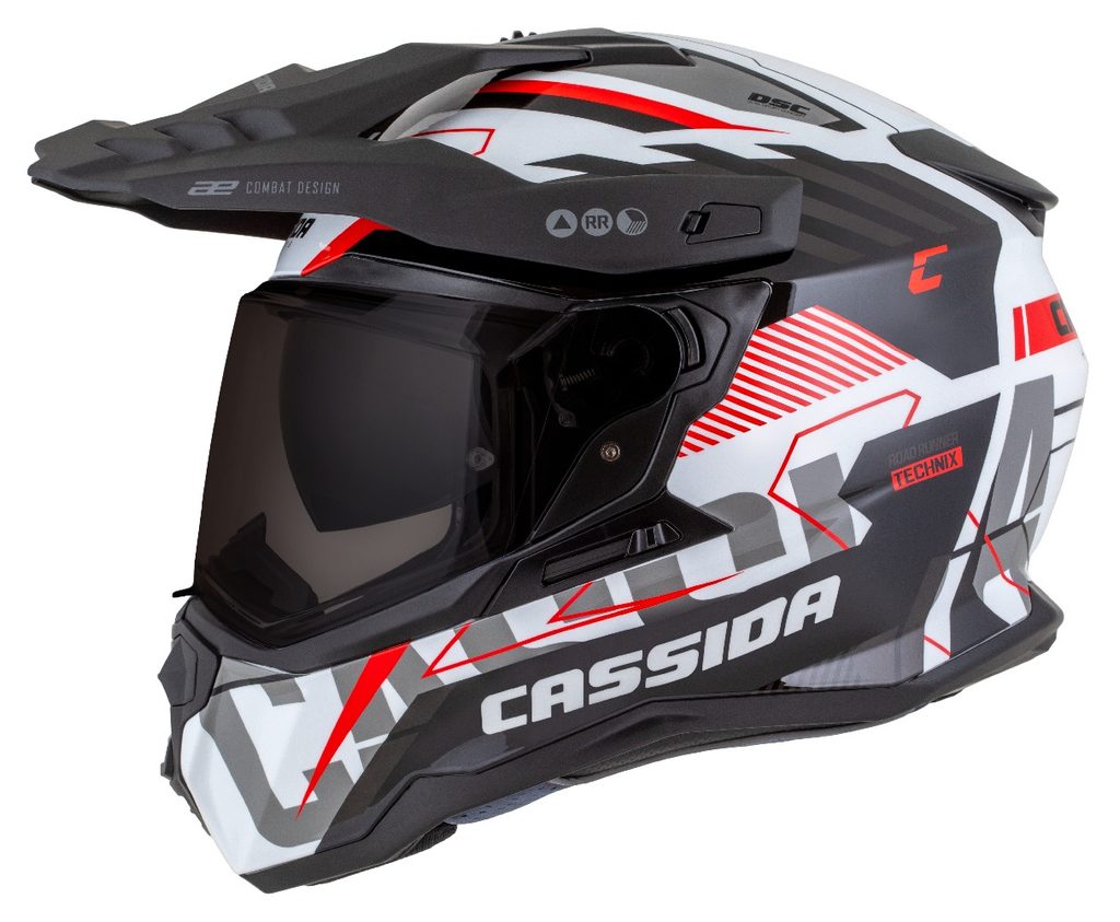 Motocross Helmet CASSIDA ROAD RUNNER TechniX white/ black/ red/ grey/ black matt peak XL