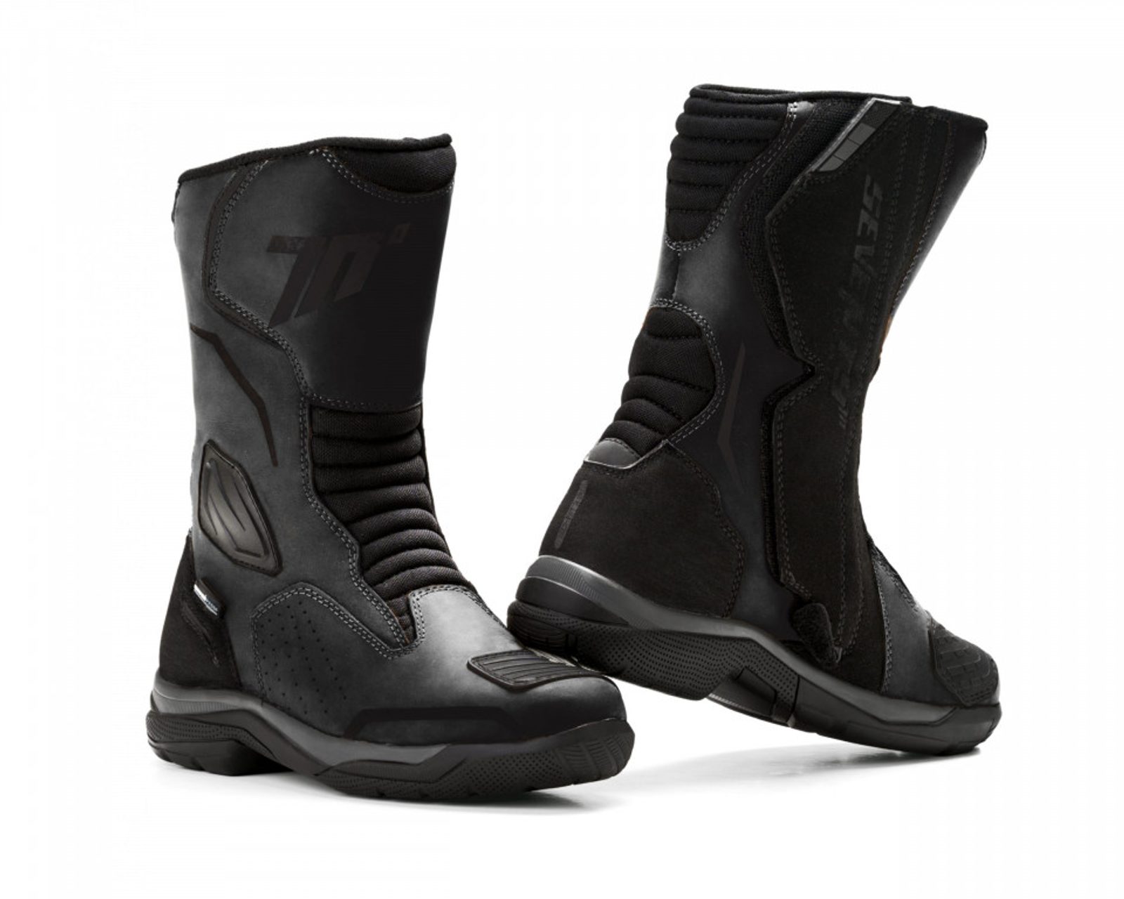 Unisex high-top waterproof Touring boot. Made of leather with PU and Nylon finish. With soft inner lining of micro-breathable fabric. Shin, heel, ankle and toe protections with instep reinforcement for gear shifting. Heavy-duty flex points for comfort with maximum protection. Reflective inserts in multiple areas to increase rider visibility. Non-slip rubber outsole with specific grip areas. Removable foam insole.