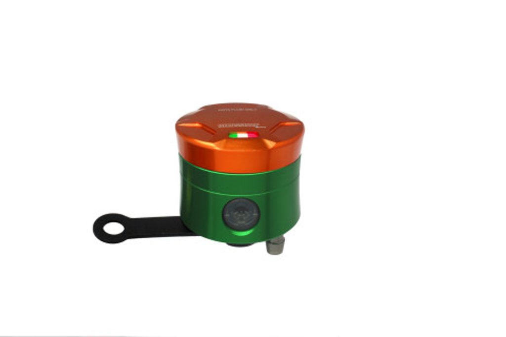 Accossato CNC-worked brake fluid reservoir, capacity of 25 cm3, vertical oil spill. Straight braket provided. You can choose the colour match of the c
